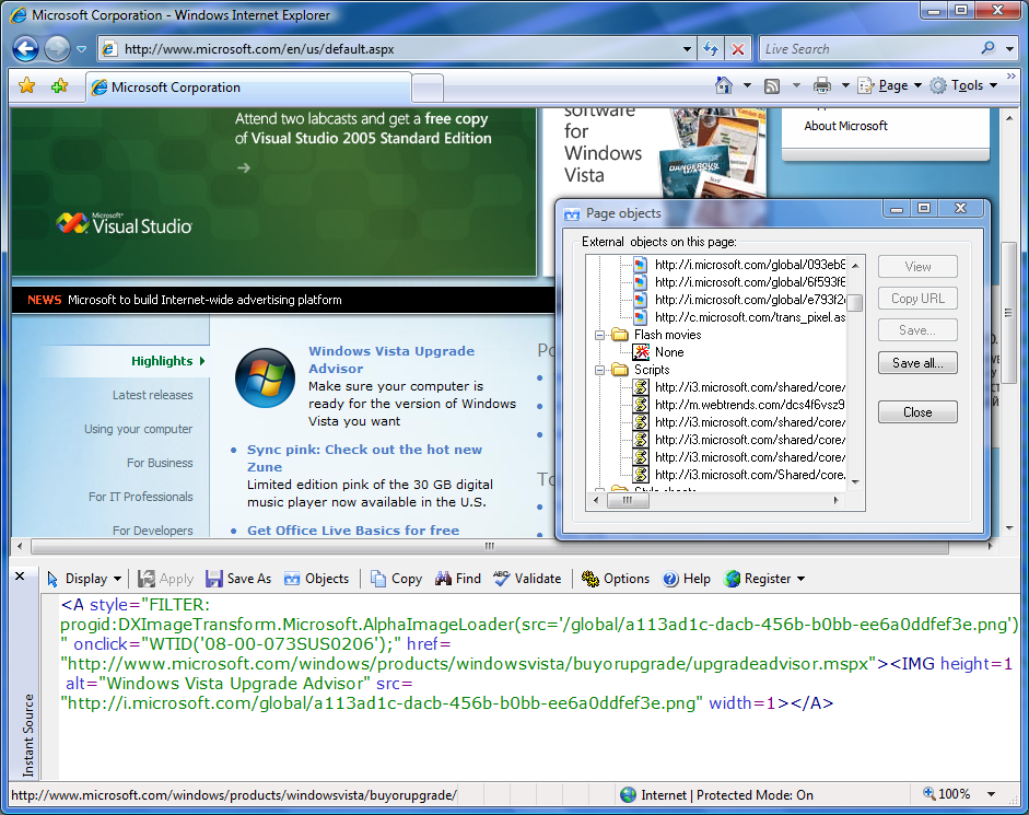 Click on the image to enlarge You can even set it to show source code for every element under your cursor, allowing you to quickly peak through the source as your cursor moves across the page. Instant Source can show all Flash movies, script files (*.JS, *.VBS), style sheets (*.CSS) and images on a page. You can save all external files into the selected folder with a one click. Other features include handy HTML, JavaScript and VBScript syntax highlighting and support for viewing external CSS and scripts files directly in the browser. Why is Internet Explorer's View Source command so inconvenient for viewing HTML? Because:
